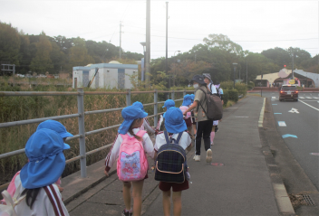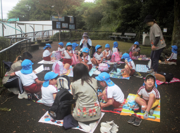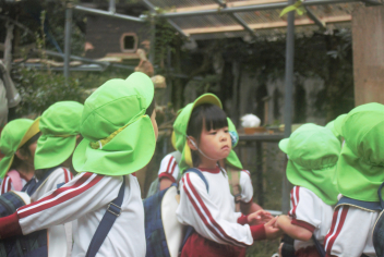 地震発生の放送と共に、子供たちは園庭の中央に身を守る姿勢で集まり地震が収まるのを待ちました。