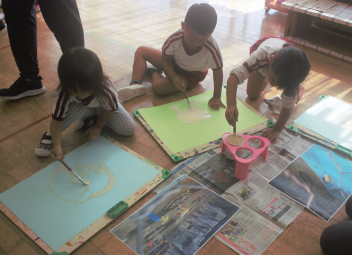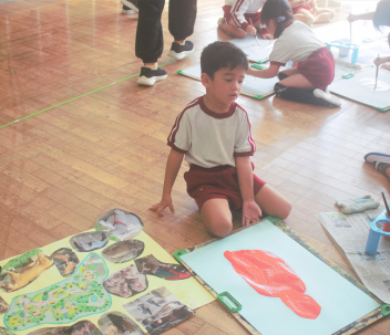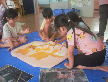 年中さんは自分が印象に残った動物を絵の具で大きく描きました。年長さんは、グループの友達と、どの動物にするか話し合ってから描きました。