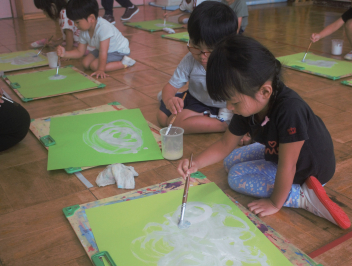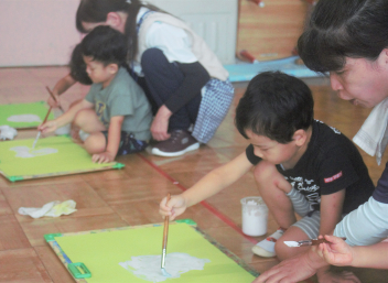 年少さんは、初めて筆を使いました。先生のお話をよく聞いて絵の具がポタポタこぼれないように、筆をトントンとしてからかいていました。ぐるぐるとかいていたら、何だか昨日、動物園で見た羊さんみたい !