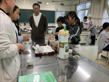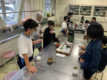 • 10月22日(水)、5年生を対象に、地域で茶業を営む宇津山製茶の日本茶インストラクターの方々を講師にお招きし、「お茶講座」を実施しました。