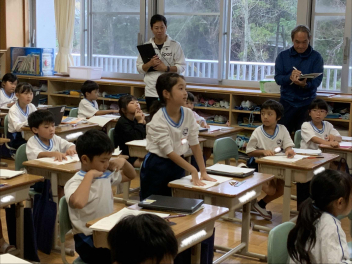 今回の研究授業は、国語科「音読劇をしよう~お手紙~」の単元でした 。本時の目標は、物語の初読時にもった感想と、がまくん・かえるくんの音読劇を経験した後に書いた感想を比較し、登場人物の行動や気持ちを自分の体験と結び付けて深く考えることです 。
