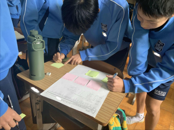 この日の授業は、「追究途中の交流」を中心に行いました。子供たちは、作成途中のレポートを互いに見せ合い、付箋などを使ってアドバイスを交換しました。
