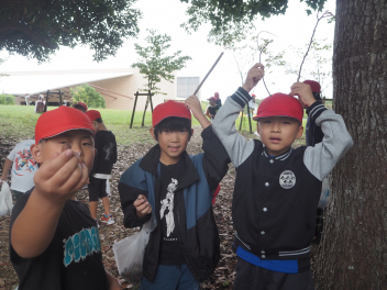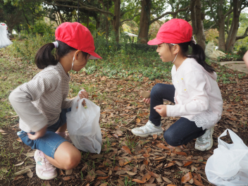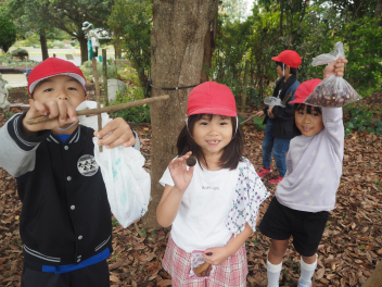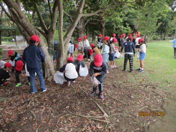 ガーデンパークには、どんぐり、まつぼっくり、落ち葉などがたくさん落ちていて、1年生は見つけた秋に目を輝かせながら観察をしていました。