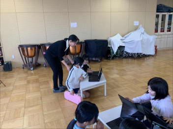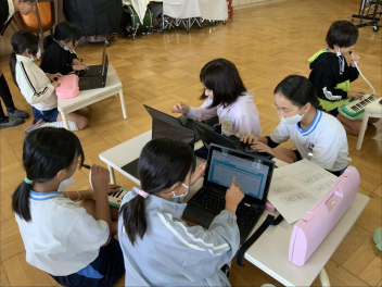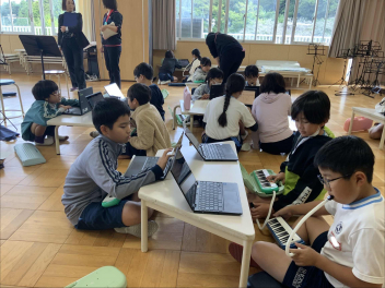 子供たちは、「旋律をつくる手順」を参考に、「おだやかな感じにしたいから、あまり音を高くしないようにしよう」「最後は盛り上げたいから、音をだんだん上げていこう」など、自分なりにイメージを膨らませ、試行錯誤しながら作曲に挑戦していました。グループで相談しながら作曲するなど、協働的に学んでいる姿も見られました。