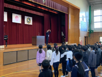 校長先生のお話の後には、2学期の終わりと3学期から新しく本校に赴任されたお2人の先生の紹介がありました。 新しい先生との出会いに、子供たちの目がキラキラと輝いていたのが印象的でした。これから授業や行事、休み時間などを通じて、たくさんの思い出を一緒に作っていければと思います。