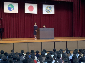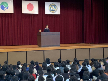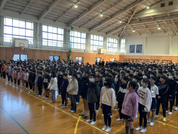 2学期の終業式と同様、今回も1年生から9年生までの全校児童生徒が体育館に一堂に会して始業式を行いました。ピンと張り詰めた冬の空気の中、背筋を伸ばして式に臨む子供たちの姿からは、新しい学期に向けた強い決意が感じられました。