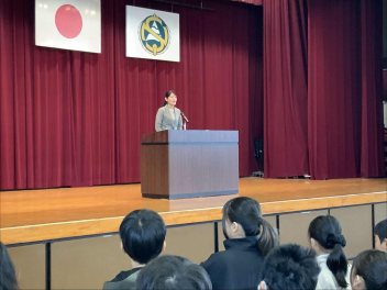 このメッセージを伝える際、ノーベル化学賞を受賞された北川進先生のインタビューを引用されました。困難に直面しても、それを発見や成長の糧とする姿勢について、子供たちは真剣に聞いていました。また、冬休み中に先生たちがブログに掲載した「ウインターレター」の内容にも触れ、改めて「夢に向かって挑戦すること」について共有されました。