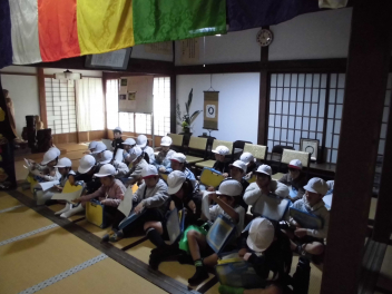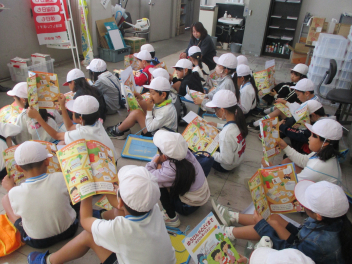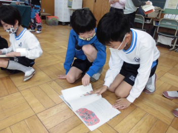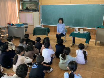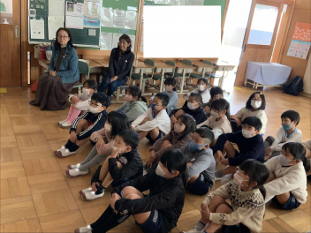 今回は教室の机を移動させ、子供たちは床に座って、語り手の方を向いて聞きました。