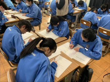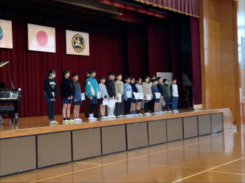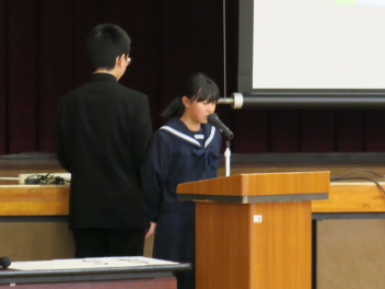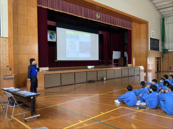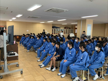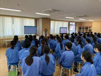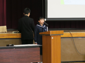 まず校長先生から「自分で考え、判断して行動することを学び、大人になる力を身に付けましょう」という中学校生活に向けての期待の言葉が贈られました。次に浜松西警察署のスクールサポーターの方から、SNSやスマートフォンの利用ルール、自転車通学の安全など、中学生及び保護者としての心構えについてお話をいただきました 。そして、生徒会執行部の生徒たちが、行事や生徒会活動、部活動などについて、後輩となる6年生へ向けて詳しく紹介しました 。