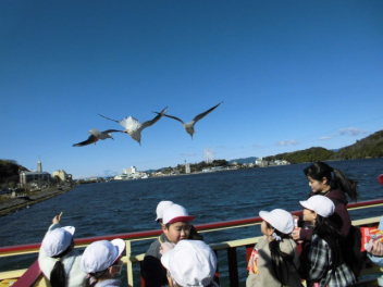 この季節ならではの光景ですが、遊覧船からはかもめに餌やりを体験しました。間近まで飛んでくるかもめたちの迫力に、最初は驚いていた子供たちも、次第にコツを掴んで上手に触れ合っていました。