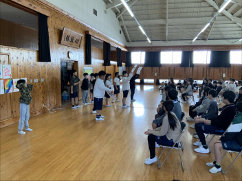 続いて行われたのは、6年生にまつわるクイズ大会です。「6年生が一番身長が伸びた人は?」「修学旅行での一番人気のアトラクションは?」「6年生の担任の黒歴史について」など、5年生が一生懸命考えた問題に会場は大盛り上がり。6年生のことをよく見ている5年生だからこそ作れる、愛のあるクイズの数々に、潮鳴館が温かな笑い声に包まれました。
