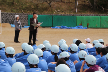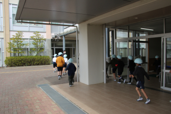 放送が入った瞬間、子供たちは一瞬驚いた表情を見せましたが、すぐにその場で姿勢を低くし、頭を守る行動をとらなければいけません。校庭にいる子はなるべく中央に集まり、しゃがむこと、校舎内にいる子は机などの下に潜り込むことが必要です。
