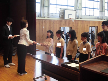 続いて行われた任命式では、各学級の学級委員、そして各委員会の委員長が名前を呼ばれ、壇上で校長先生から任命書を受け取りました。緊張した面持ちながらも、真っ直ぐな視線で「頑張ります」と言って任命書を手にする姿からは、これから自分たちが学校を引っ張っていくのだという強い自覚と誇りが感じられました。