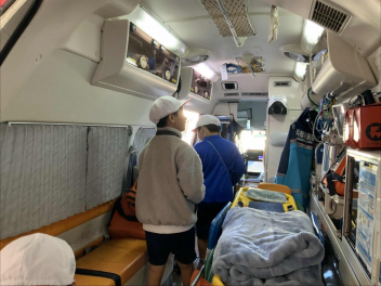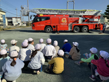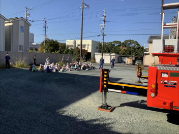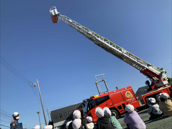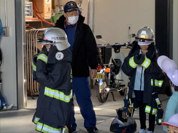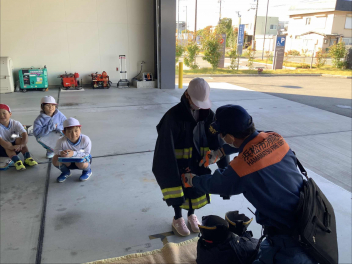 続いて、西消防署庄内出張所へ移動しました。目の前で見る消防車や救急車の大きさ、はしご車の高さ、そして装備の複雑さに子供たちは大興奮。また、実際の消防服の試着体験もさせていただきました。ずっしりとした重みを感じた子供たちからは、「こんなに重い服を着て活動するなんてすごい!」と、驚きの声が上がっていました。