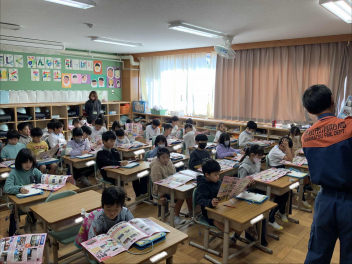 まずは教室にて、消防士さんから「消防士の一日」や「消防の仕事」についてお話を伺いました。