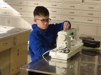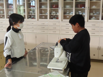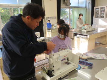 • 今日から、5年生はミシンの学習が始まります。まずは、糸のかけ方です。「うーん、こっちかな?」「糸が通らない!」と、みんな初めてのミシンに悪戦苦闘です。来週からは、ボランティアの方も来てくださるようですが、まずは、自分で頑張ってみよう!友達同士で教え合って、一つずつできるようになっています。