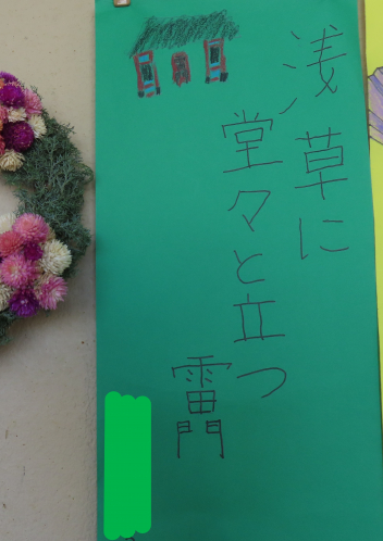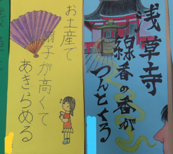 • 4年生は、有名な短歌や俳句を選んで画用紙に挿絵をつけて書いていました。有名な短歌や俳句は、昔の言葉もあったり、難しい漢字もそのまま使ってあったりするので、最初は意味も分からず「難しい。。」と言っていました。でも、担当の先生が「自分で選んだ句を一つ暗記してから、画用紙に書こうね。」と言ったから、みんな必死で覚え始めました。外国につながる子たちもローマ字を振って頑張ります。はじめは、「カキクケコ???(柿食えば)」「おーむずかしい!!」と言っていた子たちも、全員言えるようになり、得意顔です。頑張りましたね。