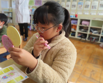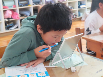 • 歯科保健教育がありました。4年生に学校歯科医の先生が、歯周病予防のためのお話をしてくださいました。歯ブラシの選び方や磨くための力の入れ方など教えていただき、子供たちは真剣に鏡を見ながら正しい磨き方を実践していました。ぜひ、お家でも子供たちの歯の磨き方を見てあげてください。みんな上手に磨けるようになりました。