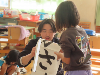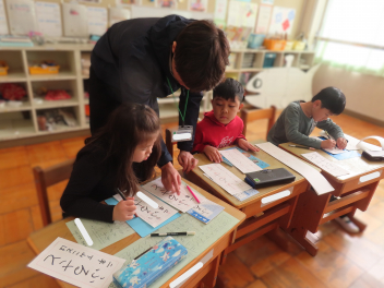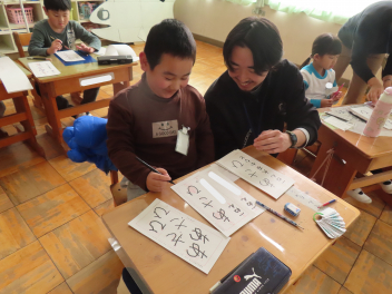 あと2人のお兄さんは、静岡文化芸術大学の「WISH(ウィッシュ)」のみなさんです。「WISH」は、学生が企画している学生ボランティア団体で、海外にルーツをもつ子供たちを中心にサポートしているそうです。月に2回ほど、定期的にメンバーを変えながら砂丘小に来てくれています。