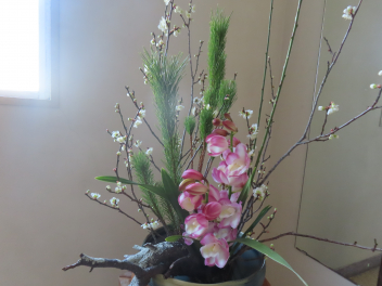 寒い廊下を縮こまりながら歩いていると、ぱっと空気が変わり、凛とした花が見えました。週が変わり、花が変わりました。今週も素敵な花をありがとうございます。高台の高い白い花器が、今日の花によく合っています。