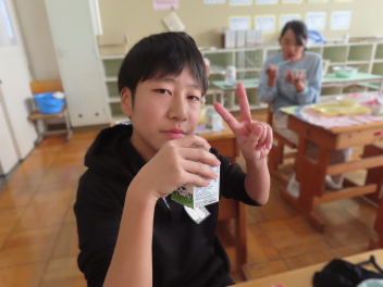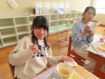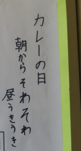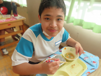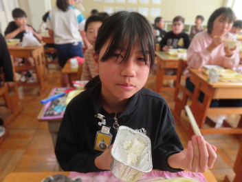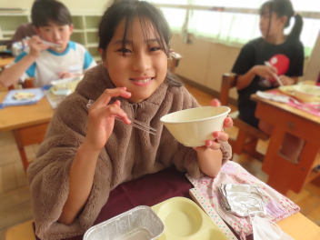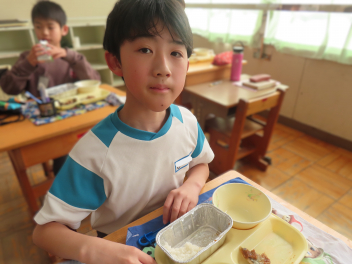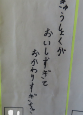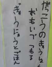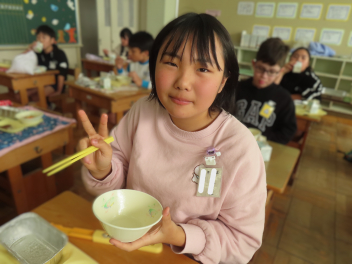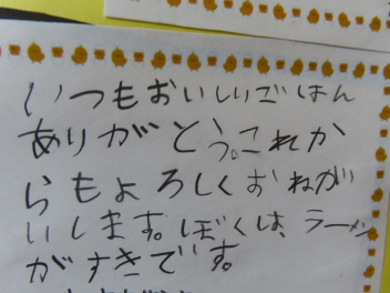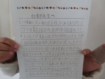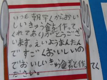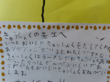 今日の昼の放送は、給食の先生から子供たちへのメッセージでした。「おいしかったよと言ってくれたとき、残さず食べてくれたとき、とてもうれしい気持ちになります。給食をもりもり食べて大きくなってください。」と子供たちへメッセージを送ってくれました。