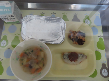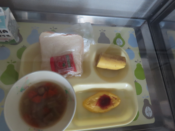 給食週間の最終日の献立は、「〈おすすめ朝ごはん〉パン、いちごジャム、牛乳、野菜スープ、オムレツ、バナナ」です。子供たちの成長のためには、栄養バランスの良い朝ごはんにしたいものですが、朝は忙しく、時間をかけて料理をすることができません。今日の献立のように、パンやバナナなどそのまま食べられるものを活用しながら、栄養バランスの良い朝ごはんを食べてほしいと思います。