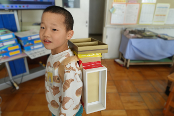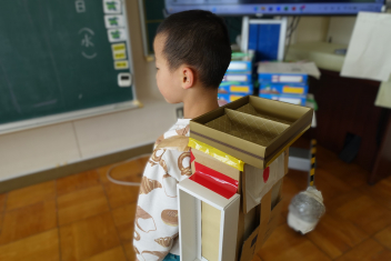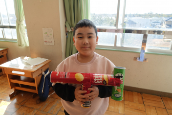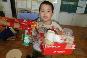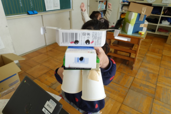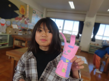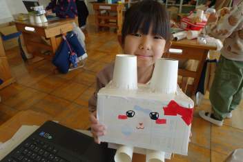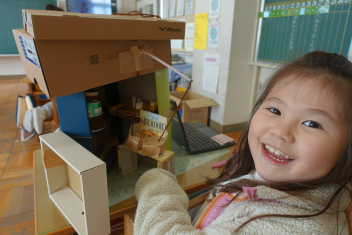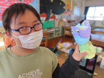 • 廊下を歩いていると「すごくすてきなハウスができたの。見に来て。」と誘われたので、1・2年生の図工の授業を見に行ってみました。行ってみると、どの子も自分の作品をうれしそうに説明しながら見せてくれます。「この動物なーんだ?」「この犬はお手もするんだよ。えさも作ったよ。」「このハウスの中にはベイビもいるよ。すごいでしょ。」「ぼくのは、リュックのようになってるよ。」などなど、みんなの工夫がいっぱいでした。