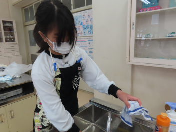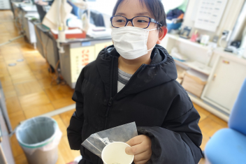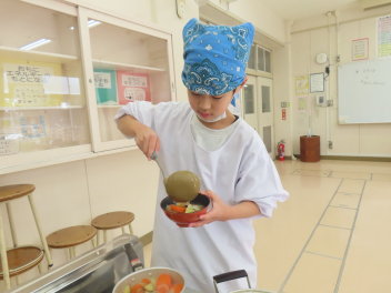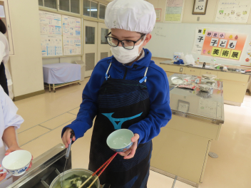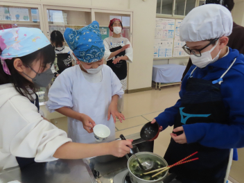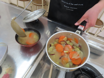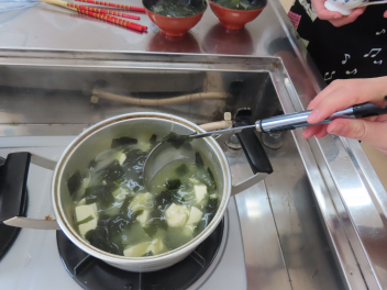 家庭科室をのぞいてみると、「先生!わかめが増え過ぎです!」「わかめがこんなに増えるなんてびっくりだよ」と言ってくる子や「うちのグループはサツマイモが入っているから他のグループより甘いんだよ」と教えてくれる子たちもいました。どの子もとてもうれしそうです。出汁の取り方もそれぞれのグループで違っていて、味の違いに驚いていました。