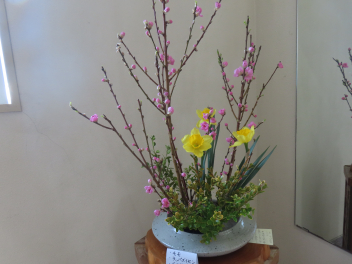 今日のお花は、モモ、ラッパ水仙、ベニツゲだそうです。「春の気温になってきているので、うまく開花して、ひな祭りまでもってくれるといいんだけど」とおっしゃっていました。モモの花と黄色の水仙が本格的な春を感じさせてくれます。
