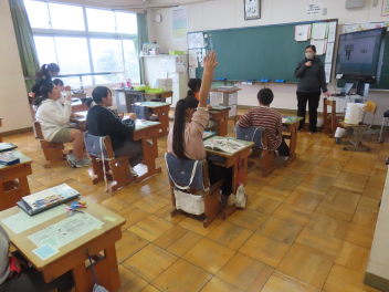 1年生は「算数」で、文章問題文を読んで式を考える学習。2・3年生は「学活」で、新1年生と仲良く遊べるゲームを、みんなで相談しながら考える学習。4年生は「2分の1成人式」で、家族への思いを込めて自分の成長を振り返る学習。5年生は「国語」で、1年生に分かるような手紙になるよう、文章を推敲する学習。6年生は「総合」で、自分の将来を見つめる学習。