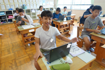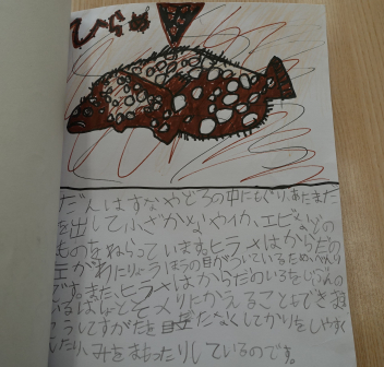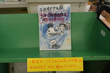 すると、図書室の一番目立つ場所に1年生の作った図鑑が置いてありました。国語科の「うみのかくれんぼ」を学習する中で、自分たちで海の生き物図鑑を作り図書室に置いてもらおうと、頑張って作ったようです。中を見てみると、教科書の文章の中に書いてあった「はまぐり」「たこ」「もくずしょい」だけでなく、自分たちで調べた生き物についても、しっかりと書かれていました。