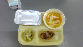 二色揚げ・大根ときゅうりのマリネです。月に一度出るソフト麺は、給食でしか味わえないメニューで、子供も大人も大好きなメニューです。今週で給食が終わります。よく噛んで、味わって食べましょう。