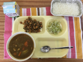 また、今日の給食は、米飯、牛乳、チキンカレー、大豆と煮干しの甘辛あえ、キャベツの香りづけでした。本年度初めてのカレーは、大きく切ったじゃがいもがゴロゴロ入ったチキンカレーで、とても美味しかったです!