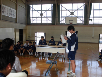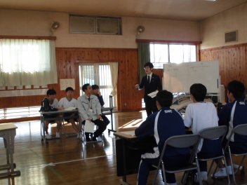 書店で万引きをした被告人(教員)に対する裁判を、裁判長、裁判官、弁護人、検察官、証人のそれぞれの役を生徒が演じて裁判の体験しました。