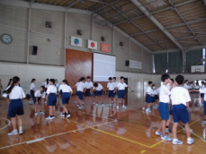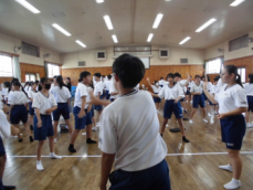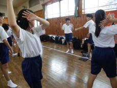 上級生が全員で下級生に動きの見本を見せていました。素晴らしいのは現時点での完成度の高さ。3年生一人一人が不安感なくしっかりと動きを身に付けていることに事前準備のきめ細かさがうかがえました。ノリもよく、下級生が恥ずかしさを持たずに練習できる雰囲気が感じられました。