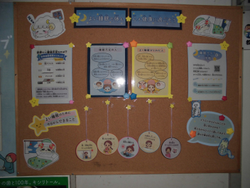 保健室前と昇降口には、保健委員が製作した学校保健週間に関する掲示物が貼られています。