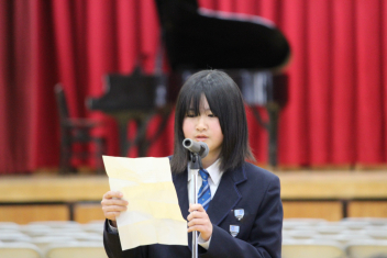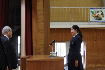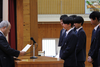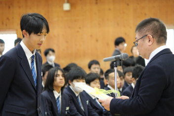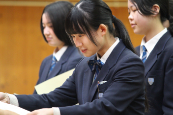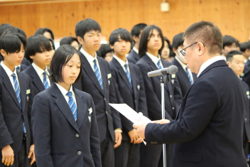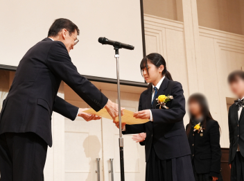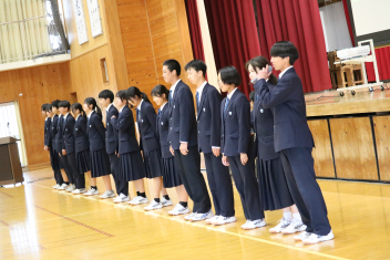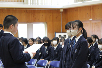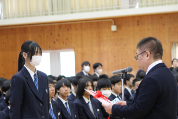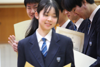 •  本日、修了式が行われました。式に臨んだ1・2年生の表情からは、この一年間をやり遂げた充実感と、4月からそれぞれ「先輩」「最上級生」へとステップアップする自覚が感じられました。会場には心地よい緊張感が漂い、校長先生の話に真剣に耳を傾ける姿からは、次年度に向けた強い決意が伝わってくるようでした。また、修了式に先立ち「顕彰式」が行われました。 この式典では、部活動や校外活動において目覚ましい成果を収めた生徒に対し、同窓会よりその功績を讃えて表彰状と記念品が授与されました。壇上で表彰を受ける仲間の姿は、他の生徒たちにとっても大きな刺激となったはずです。多方面で才能を発揮する生徒たちを、同窓会の皆様が温かく支援してくださっていることに、この場を借りて深く感謝申し上げます。