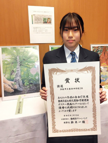 •  このたび「国土緑化・育樹ポスター原画コンクール」において、本校の3年生女子生徒が見事、静岡県グリーンバンク理事長賞(特選)を受賞しました。先日行われた表彰式にも出席し、堂々とした姿で賞状を受け取りました。