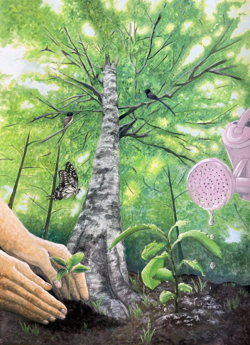今回受賞した作品は、豊かな自然と人間との関わりを、独自の視点で描き出した力作です。画面中央にそびえ立つ大樹を、地面に近いローアングルから見上げるように描き、空へと伸びていく樹木の生命力が、圧倒的な迫力で伝わってきます。また、羽を休める蝶や、枝に集まる小鳥たちなど、鮮やかな緑のグラデーションの中に見える生き物たちが共生する様子は、見ているだけで森の息吹を感じるようです。