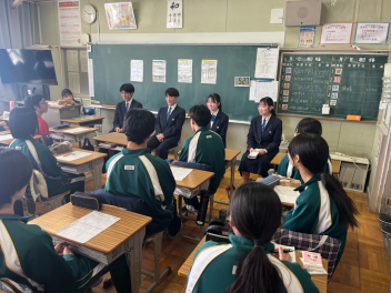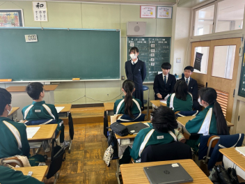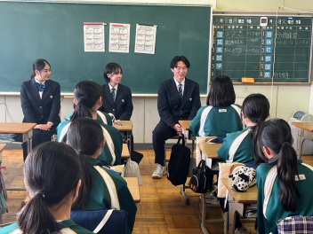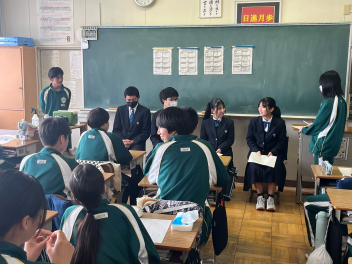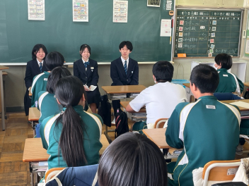 •  「3年生と語らう会」が開催されました。つい先日、高校入試を終えたばかりの3年生たちが、1・2年生の教室を訪れ、自分たちの3年間の歩みについて語ってくれました。3年生は、入試に向けた勉強の進め方はもちろん、行事や部活動を通じて得た「学び」や、困難を乗り越えたときの「気づき」など、実体験に基づいた貴重な話をしてくれました。「もっと早くから準備しておけばよかった、という率直な反省」「仲間の存在が支えになった、という感謝の言葉」「最後まで諦めないことの大切さ」など、一つひとつの言葉に、3年間の重みが感じられました。先輩たちのリアルな体験談を前に、1・2年生の表情は真剣そのもの。メモを取りながら一言も聞き漏らすまいと耳を傾ける姿が印象的でした。質疑応答では、「スランプの時はどうしていましたか?」「苦手科目との向き合い方は?」といった具体的な質問も飛び出し、3年生も丁寧に答えてくれました。