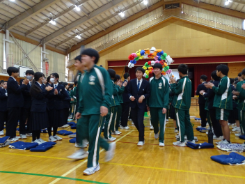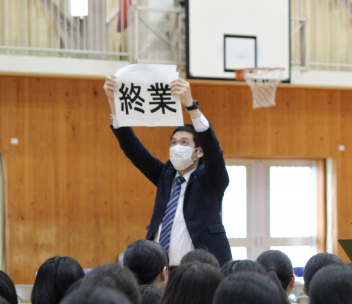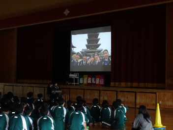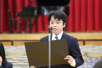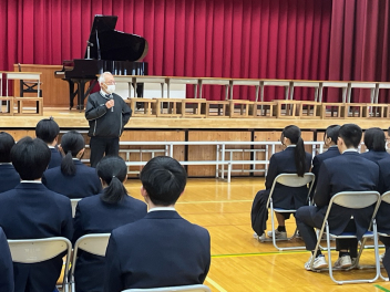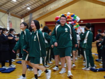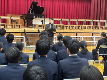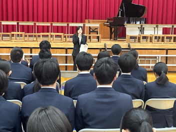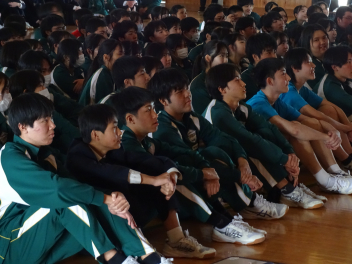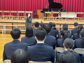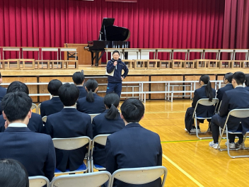 •  卒業式を目前に控えたこの日、3年生にとって最後となる学年集会が開かれました。今回の集会では、3年部の先生全員が生徒たちへ向けて一人ずつメッセージを贈りました。先生方からは、3年間の行事や日常の中での懐かしい思い出話や、これから新しい世界へ踏み出す生徒たちへのエールが語られました。笑いあり、時には真剣な表情ありの、締めくくりにふさわしい温かな時間となりました。3年生の皆さん、先生方の言葉を胸に、自信を持って次のステップへ進んでください。