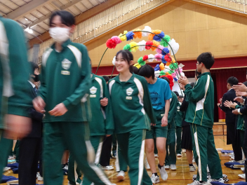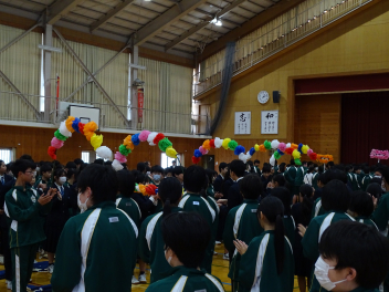 •  卒業式を間近に控えたこの日、3年生を送る会が開催されました。これまで学校を力強く引っ張ってくれた3年生へ、在校生全員で心からのエールを送る大切な時間となりました。会では、在校生が各クラスで趣向を凝らして制作した「お祝いと感謝のビデオメッセージ」を視聴しました。「今までありがとうございました!」という真っ直ぐな言葉の数々。スクリーンを見つめる3年生の目には、どこか照れくさそうながらも、感慨深い表情が浮かんでいました。また、生徒会によるお楽しみ企画「先生クイズ」では、3年生も在校生も一緒になって大盛り上がり。正解が発表されるたびに歓声と拍手が沸き起こり、学年の枠を超えた一体感に包まれました。