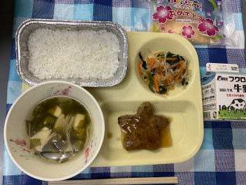 お祝いの日には欠かせない人気メニューのハンバーグ。今日は甘辛い照り焼きソースをかけ、やみつきになる味です。ごはんとの相性も抜群で、教室からはおかわりを求める元気な声が聞こえてきました。