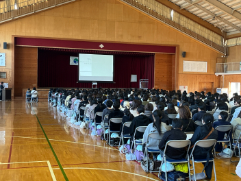 •  新年度入学予定の小学6年生と保護者の皆様をお迎えして、新入生説明会を開催しました。会が始まる前には、1・2年生の授業の様子を参観してもらいました。真剣に学習に向き合う中学生の姿が、4月からの中学校生活をイメージするのに役立ったのなら嬉しいです。その後の説明会では、様々な話が伝達されました。50分間という時間は、ちょうど中学校の授業と同じでしたが、集中して話を聴く姿が見られ、安心しました。入学式で皆さんにお会いするのを心待ちにしています。