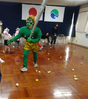 •  「うおーーー!」という力強い声とともに、幼稚園に現れた鬼。 実はこの鬼は、本校の教職員が変装した姿なんです。子どもたちの健やかな成長を願い、全力で鬼役を務めてきました。必死に豆を投げる園児たちの姿に、鬼は圧倒されっぱなし。「参りました」と逃げ帰る頃には、心なしか鬼の表情も優しくなっていきました。