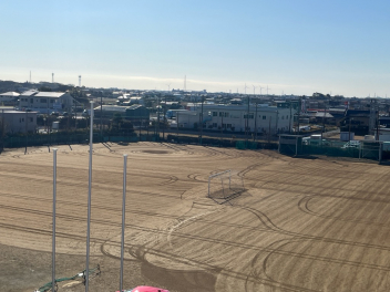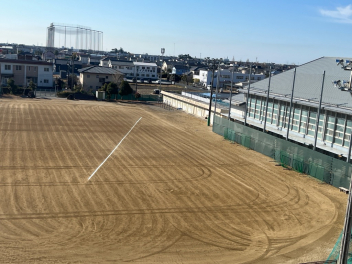 •  先日、専門の業者の方々にグラウンドの整備をしていただきました。ふと4階の教室からグラウンドを見下ろすと、そこには驚くほど美しい光景が広がっていました。整地されたばかりの砂紋が、太陽に照らされて幾何学模様のように浮かび上がり、「ナスカの地上絵」をほうふつとさせます。普段、生徒が元気に走り回っている場所が、まるでひとつのアート作品のようです。