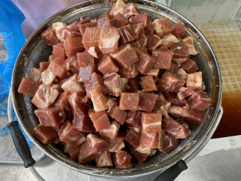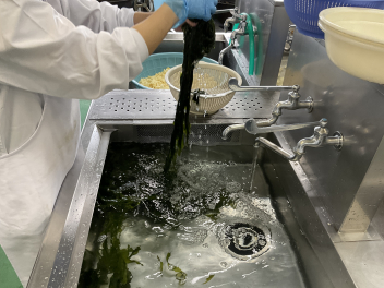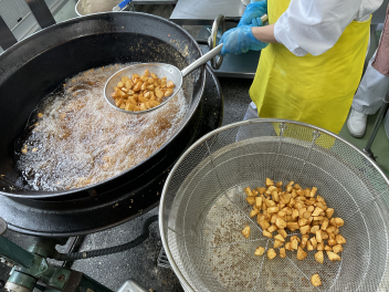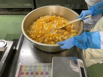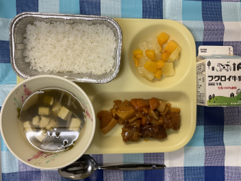 メインは、ボリュームたっぷりの「酢豚」。 甘酸っぱいタレがごはんにぴったりで、食欲をそそります。 温かい「わかめスープ」でホッと一息つきながら、デザートの「ミックスフルーツ」まで、みんなペロリと食べていました。