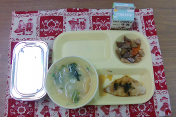 • ごはん、牛乳、あじのねぎソースかけ、うま煮、みそ汁でした。