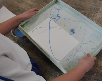 ストローやビー玉、金網などの用具を使い、筆とはまた違う表現を楽しみました。