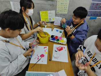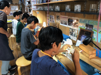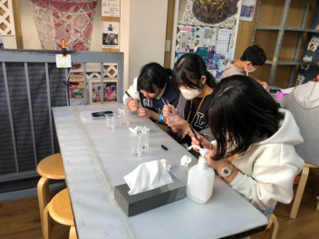 コップに油性ペンで下書きをし、研磨機で削りました。 思い思いのデザインを形にしています。